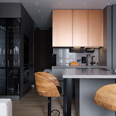 Объединяющим элементом зоны кухни-столовой и гостиной стала композиция встроенных шкафов, эффектно скрывающих короб с коммуникациями. Фасады выбрали из суперматового пластика c легким металлическим отблексом, оттенок которого играет при разном освещении, к тому же на нем не остаются следы пальцев. Со стороны столовой композицию дополнили открытыми полками для хранения декора. Встроенная в них подсветка поддерживает уютное теплое вечернее освещение.